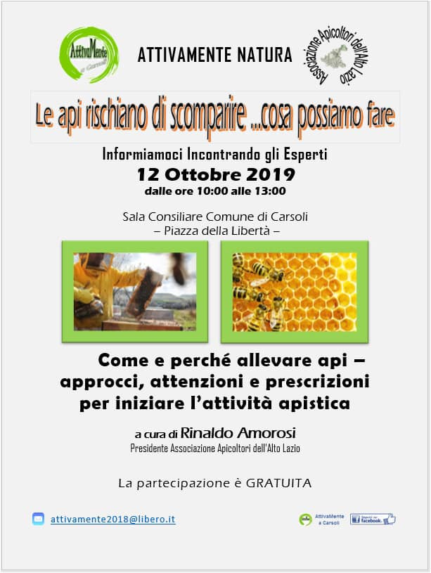 L’appuntamento è per Sabato 12 Ottobre, presso la Sala Consiliare del Comune di Carsoli. Dalle ore 10 alle ore 13.00 dunque spazio anche per avere informazioni sull’attività apistica, e le sue affascinanti potenzialità. L’associazione invita tutti a partecipare.