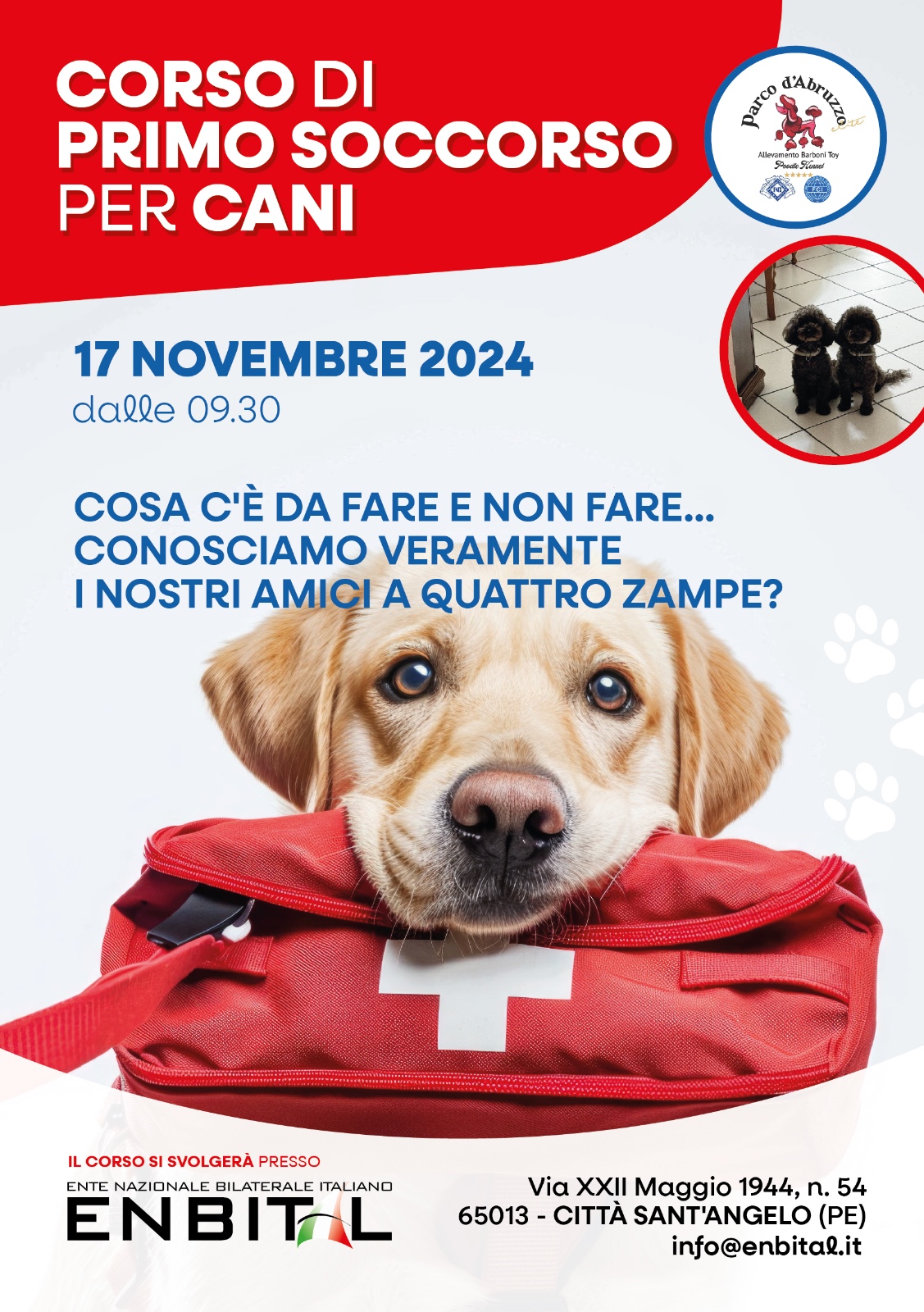 Domenica mattina 17 novembre alle ore 9.30, presso la sede dell’ENBITAL (Ente Nazionale Bilaterale Italiano) in via XXII Maggio 54, a Città Sant’Angelo (Pe) si terrà una lezione di primo soccorso per gli amici a quattro zampe: in una situazione di emergenza che vede coinvolto il cane da compagnia cosa c’è da fare o cosa non va assolutamente fatto?