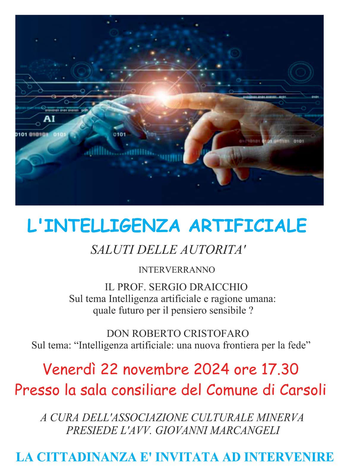 CARSOLI – Appuntamento con l’associazione Minerva che organizza per venerdì 22 novembre 2024 alle ore 17.30 un convegno sul tema dell’intelligenza artificiale. Modera l’Avv. Giovanni Marcangeli, relatori il professore Sergio Draicchio storico docente dell’Omnicomprensivo di Carsoli ed il parroco don Roberto Cristofaro. Di Seguito il dettaglio evento: