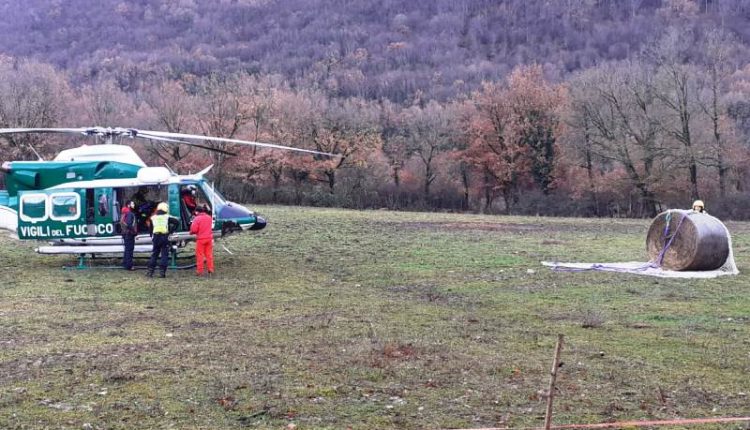 Animali isolati a Camposecco di Camerata, i Vigili del Fuoco portano il fieno con l’elicottero