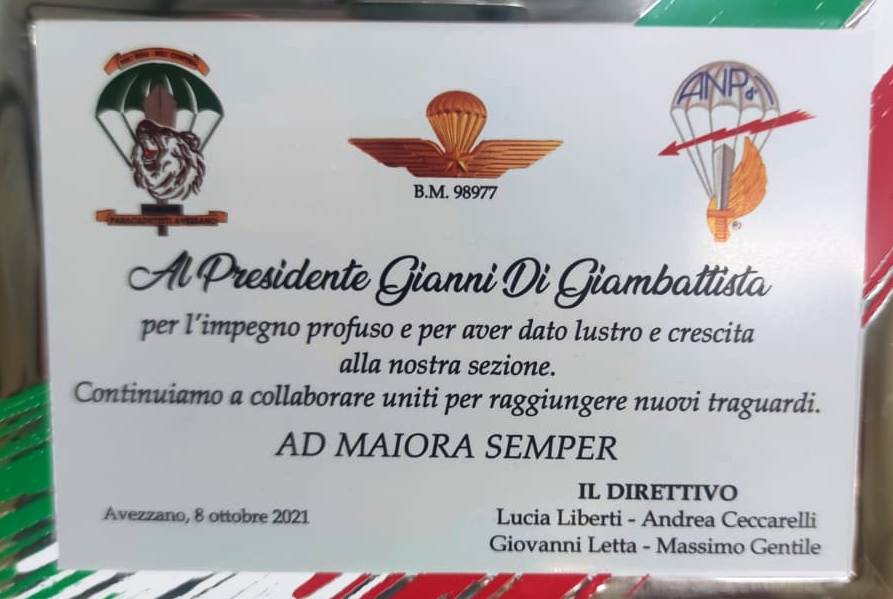 Avezzano – L’Associazione Nazionale Paracadutisti d’Italia sezione di Avezzano, ha conferito al presidente Gianni di Giambattista una targa di merito. Il direttivo, ha voluto infatti riconoscere le qualità organizzative ed il profondo senso della prestigiosa istituzione nonchè l’impegno costante profuso per l’affermazione dei valori morali dell’Associazione. “Sono onorato e commosso per questo riconoscimento inaspettato – commenta il presidente Di Giambattista – ciò mi spinge ancora di più nel proseguire nell’impegno con la squadra di Avezzano e con l’attuazione di sinergie per i nostri valori. Grazie di cuore”