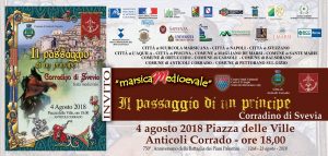 Anticoli Corrado – In occasione del 750° Anniversario della battaglia dei Piani Palentini, il bellissimo e suggestivo borgo di Anticoli Corrado si tinge di storia e di cultura medievale con ” Il passaggio di un principe – Corradino di Svevia”. Una occasione dove verrà proposta una tappa del progetto storico-medioevale-rievocativo. nato dalla volontà di riscoprire e riproporre l’evento storico dell’evento medioevale che ha cambiato le sorti dell’Europa e dell’intera Italia, quale quello della Battaglia di Tagliacozzo (Inferno, Canto XXVIII) combattuta nei Piani Palentini il 23 Agosto1268 presso Scurcola Marsicana, tra l’ultimo discendente della Casa Normanno-Sveva di Federico II e la Casa Angioina, in virtù della quale sono stati riproposti gli ultimi percorsi dei due protagonisti “Il Destino di un Cavaliere” (Corradino di Svevia) della Casata Sveva e “Le Sorti di un Re” (Carlo I D’Angiò) della Casata Angioina. L’appuntamento è per sabato 4 agosto 2018