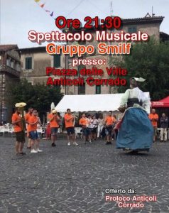 Anticoli Corrado – Questa sera alle ore 21.30 il Gruppo Smilf si esibirà in Piazza delle Ville con uno spettacolo musicale di intrattenimento. La street folk band aveva dovuto interrompere i concerti in seguito all’emergenza sanitaria, e ora torna più carica che mai a suonare e a far divertire il pubblico.