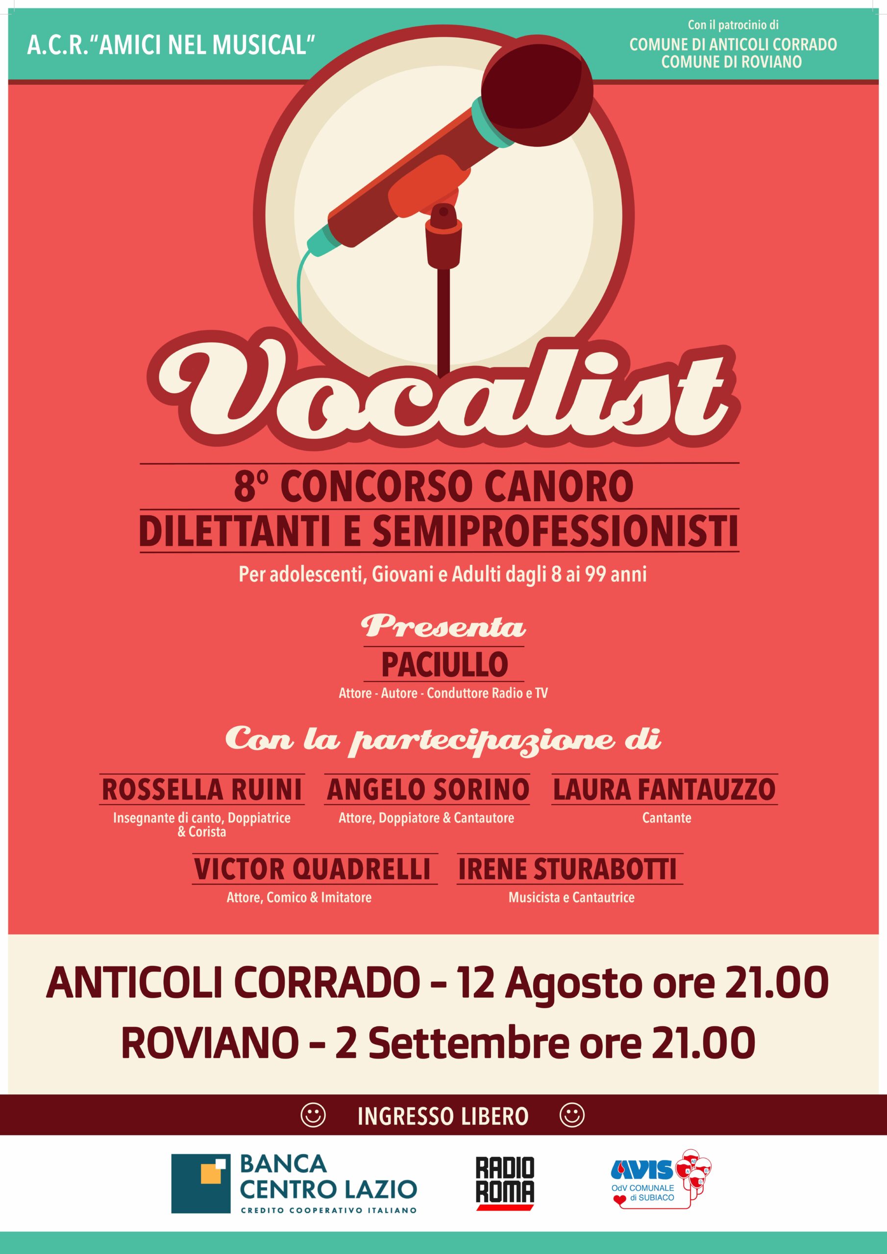 Questa modalità racconta da sola come l’evento organizzato nella Valle dell’Aniene sia lontano anni luce da quei concorsi che fagocitano i soldi delle iscrizioni per poi invitare solo pochissimi concorrenti alle fasi finali. “Vocalist”, è invece un prodotto brillante e genuino nato dall’ingegno di Roberto Barone il quale ogni anno, con entusiasmo e dedizione, cerca ed ottiene le sponsorizzazioni che gli permettono poi di organizzare serate di musica indimenticabili. Roberto, avete anche aiuti da parte delle istituzioni presenti sul territorio, per esempio il comune? R. Barone: “Ogni anno organizziamo armati solo di tanta passione e voglia di fare.” Che cosa ti aspetti da questa ottava edizione di “Vocalist”? R. Barone: “Arrivare un gradino più su rispetto allo scorso anno.” Perché quest’anno avete deciso di inserire una semifinale? R. Barone: “Per avere un maggior numero di partecipanti che si possano esibire e per dare più opportunità a loro”. Credi che il successo della manifestazione sia dovuto alla formula vincente o soprattutto alla grande partecipazione di pubblico, appassionati e addetti ai lavori? R. Barone: “La formula piace, la passione e l’onestà intellettuale si percepiscono. Anticoli sarà una bellissima incognita”. Avresti mai pensato che “Vocalist” avrebbe incontrato il favore del pubblico a questi livelli? R. Barone: “No, ogni anno cresce più di ogni benevola previsione”. Quest’anno, il concorso si articolerà in due serate. Ad Anticoli Corrado, il 12 agosto 2023 alle ore 21:00 si svolgerà la semifinale per i soli semiprofessionisti e a Roviano, il 2 settembre 2023 alle ore 21:00 avrà luogo la finale alla quale prenderanno parte i dieci semiprofessionisti che avranno vinto ad Anticoli e i concorrenti prescelti dalla direzione artistica appartenenti alle altre due categorie in gara, vale a dire i giovanissimi e i dilettanti. Il 10 agosto, i semifinalisti avranno diritto a partecipare ad una masterclass gratuita finanziata dall’A.C.R. “Amici nel Musical” e condotta da Rossella Ruini, apprezzata autrice ed interprete attiva anche nel mondo del doppiaggio (voce di Mulan e Cinderella) che vanta collaborazioni con grandissimi nomi della musica come Pino Daniele, Ennio Morricone e Claudio Baglioni. Il concorso è aperto a tutti i cantanti, senza limiti di età, che potranno proporre opere di tutti i generi musicali e, da quest’anno, anche inediti. L’ottava edizione di “Vocalist” sarà presentata da Paciullo (attore-autore-conduttore radio e tv) e i cantanti in gara saranno valutati da una giuria tecnica composta da Rossella Ruini (insegnante di canto, doppiatrice e corista), Angelo Sorino (attore, doppiatore e cantautore), Victor Quadrelli (attore, comico ed imitatore), Laura Fantauzzo (cantante) e Irene Sturabotti (musicista e cantautrice). Quest’anno, “Vocalist” avrà l’onore di avere tra i suoi ospiti il maestro Giovanni Pelosi, chitarrista conosciuto a livello nazionale per la sua bravura ed eleganza nel fingerpicking, nonché direttore artistico del Festival Internazionale Ferentino Acustica.