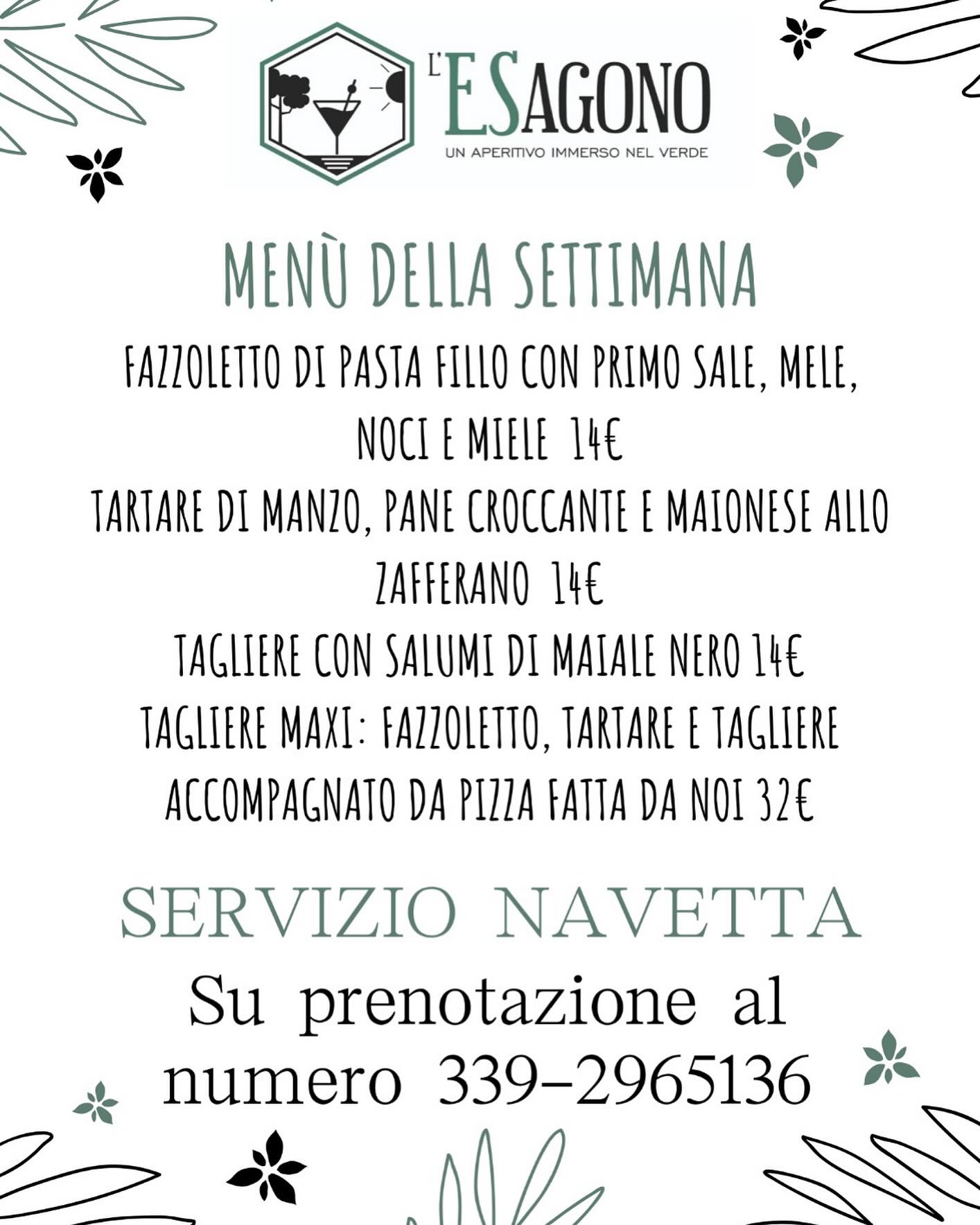 Per info sugli aperitivi e prenotazione tavoli L’Esagono: dal veneerdì alla domenica di tutte le settimane dalle ore 17.00 alle 22.00