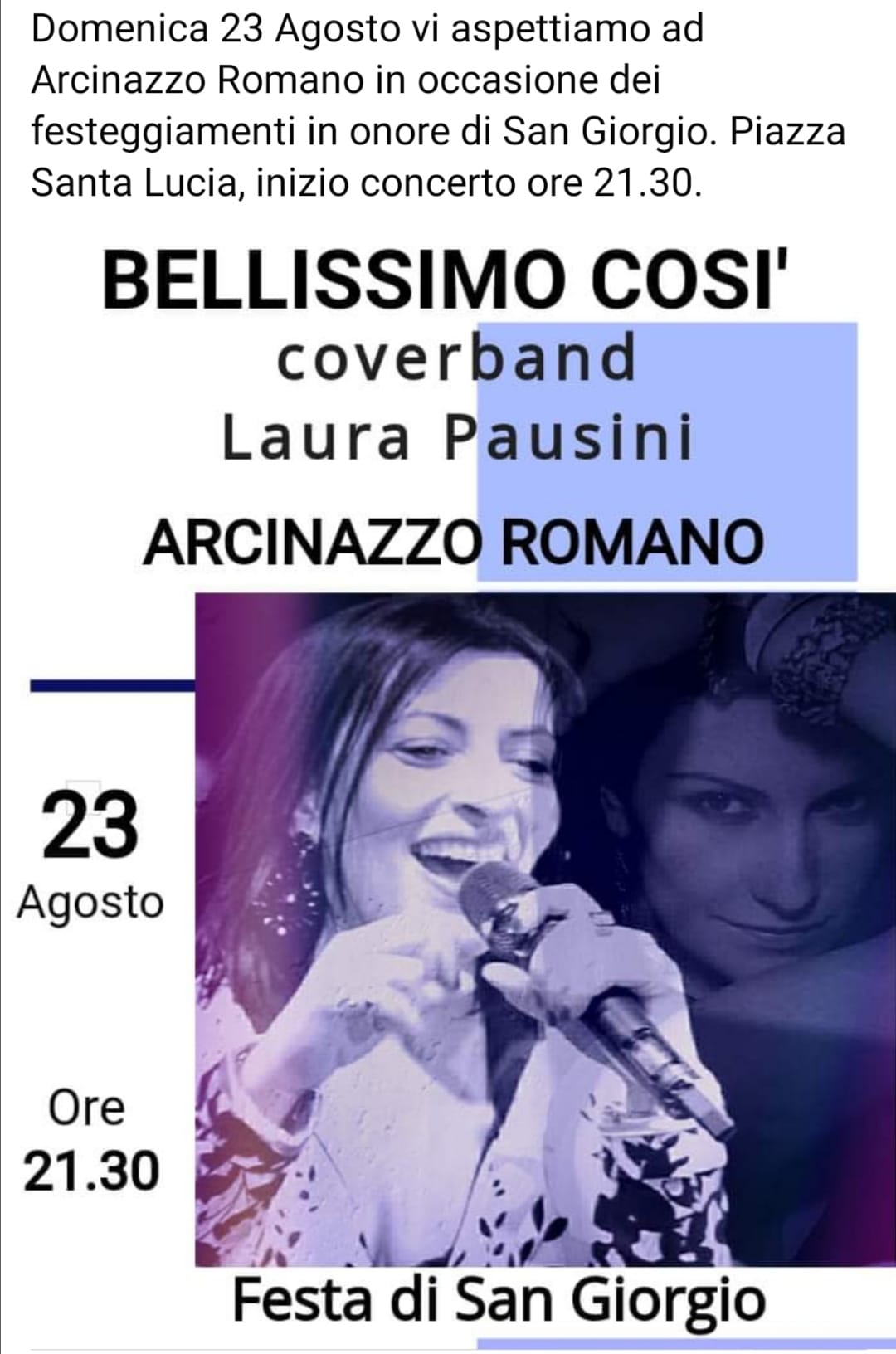 Arcinazzo Romano – Domenica 23 agosto ad Arcinazzo Romano, in occasione dei festeggiamenti in onore del patrono San Giorgio, si terrà il concerto “Bellissimo così”, con la cover band di Laura Pausini. Una serata di musica e allegria all’insegna delle cover delle hits più belle della cantante romagnola di fama mondiale, riproposte da una delle cover band più talentuose d’Italia.