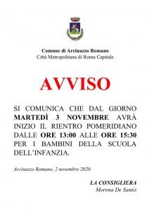 Arcinazzo Romano – Da domani, martedì 3 novembre, avrà inizio dalle ore 13.00 fino alle 15.30 il rientro pomeridiano nella scuola dell’Infanzia del comune di Arcinazzo Romano.