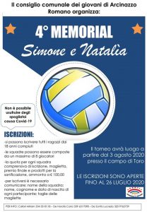 Il consiglio comunale dei giovani di Arcinazzo Romano ripropone il 4° torneo di pallavolo “Memorial Simone e Natalìa. A partire dal 3 agosto, il torneo avrà luogo presso il campo di Toro. Per partecipare al memorial è richiesta una iscrizione obbligatoria della squadra entro il 26 luglio.