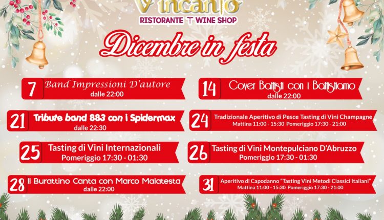 L’enogastronomia sarà di scena unitamente ad un mix di spettacolo e di professionalità. Un Dicembre in festa dunque da trascorrere nell’armonia del “V’Incanto Enoteca” di Carsoli, locale che ha ottenuto il riconoscimento ufficiale ministeriale di “Eccellenze Italiane”.