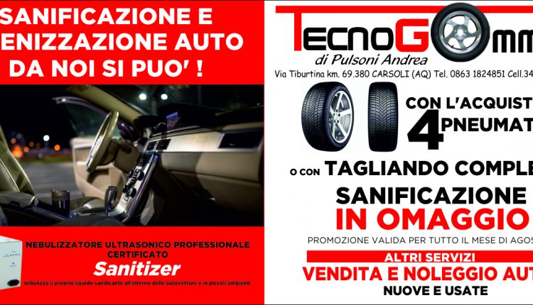 Carsoli – Per tutto il mese di Agosto Tecnogomme Carsoli lancia una importante e fondamentale promozione che consente di sanificare ed igienizzare la propria auto gratuitamente con l’utilizzo di un macchinario innovativo. Si tratta del “Sanitizer“, una sofisticata apparecchiatura nebulizzante ultrasonico professionale che consente di rimuovere virus, germi, batteri sui tessuti e superifici e tutti gli interni dell’abitacolo.