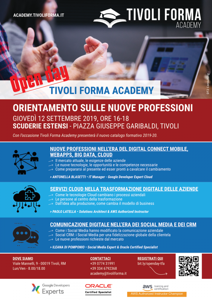 Tivoli Forma Academy e il Comune di Tivoli organizzano il prossimo 12 Settembre, una giornata di orientamento sulle nuove professioni nell’era digitale: Mobile, WebApps, Big Data, Cloud, Social Media e CRM.