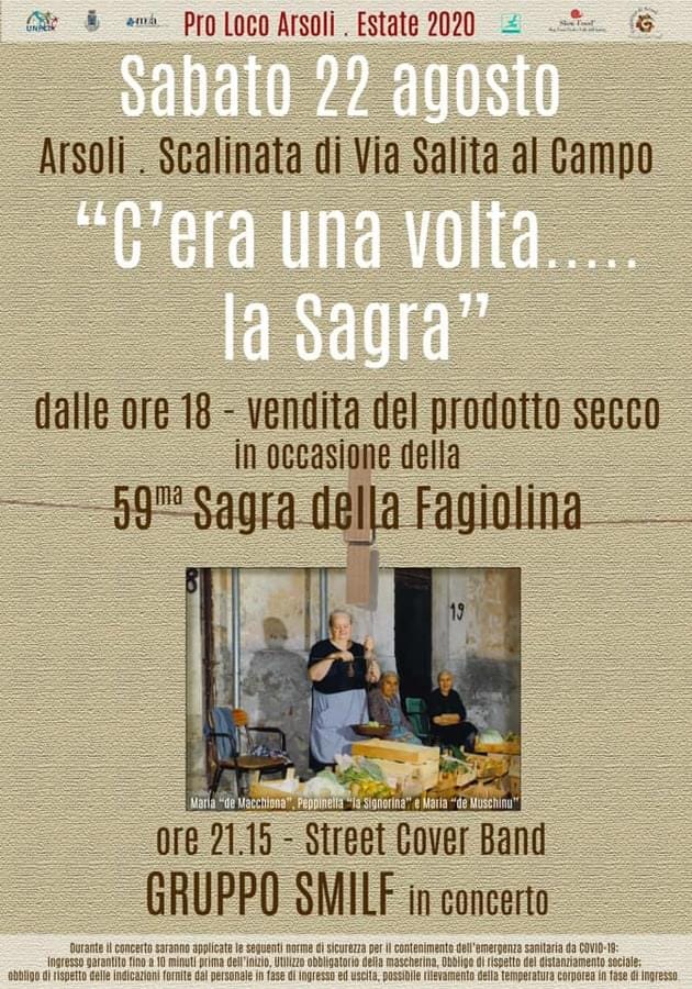 Arsoli – “C’era una volta la Sagra…”: sarà speciale quest’anno la Fagiolina di Arsoli con il ritorno alle origini. A causa del coronavirus non è possibile proporre una cena in piazza con piatti e con il primo presidio Slow Food della Val d’Aniene, e così la Pro Loco ha organizzato una “Sagra della Fagiolina” così come è nata 59 anni fa. Donne in costume metteranno in vendita, sulla Scalinata della via Salita al Campo, la Fagiolina in una busta speciale creata a ricordo di questa edizione.