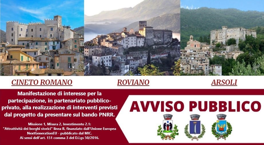 ARSOLI – I comuni di Cineto Romano, Roviano ed Arsoli hanno diramato l’avviso pubblico – “Manifestazione di interesse per la partecipazione, in partenariato pubblico-privato, alla realizzazione di interventi previsti dal progetto da presentare sul bando PNRR, Missione 1, Misura 2, Investimento 2.1: “Attrattività dei borghi storici” linea B, finanziato dall’Unione Europea – NextGenerationEU – pubblicato dal (MIC). Ai sensi dell’art. 151 comma 3 del D.Lgs 50/2016. “