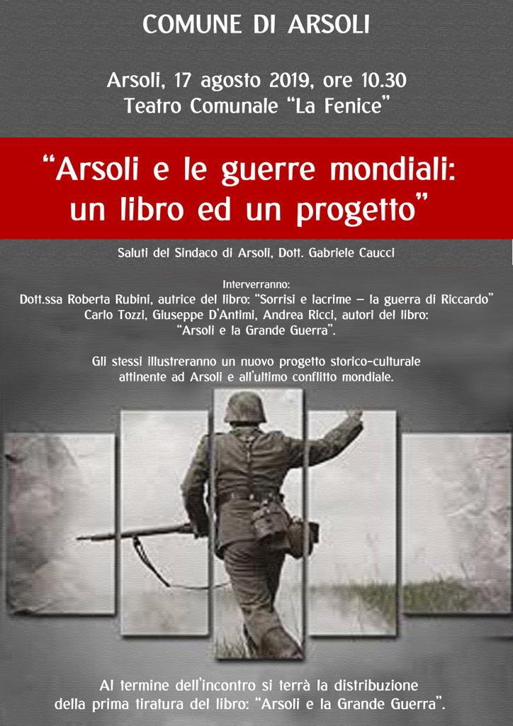 Arsoli – L’appuntamento con la storia e la cultura è per Sabato 17 Agosto 2019 alle ore 10.30 del mattino presso il Teatro La Fenice, per la presentazione di “Arsoli e le guerre mondiali, un libro ed un progetto”. Una occasione per incontrare diversi autori che illustreranno le tappe di questo progetto culturale che lega Arsoli alla storia.