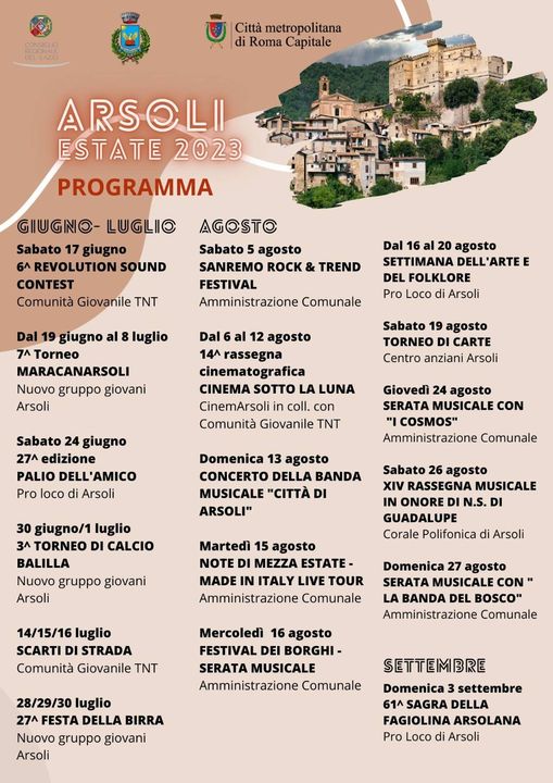 ARSOLI – Il prosssimo appuntamento è il Sanremo Rock Festival: sabato 5 Agosto 2023 in piazza Valeria, poi dopo i successi delle precedenti iniziative prosegue l’estate ad Arsoli con tante altre serate. Di Seguito il dettaglio evento: