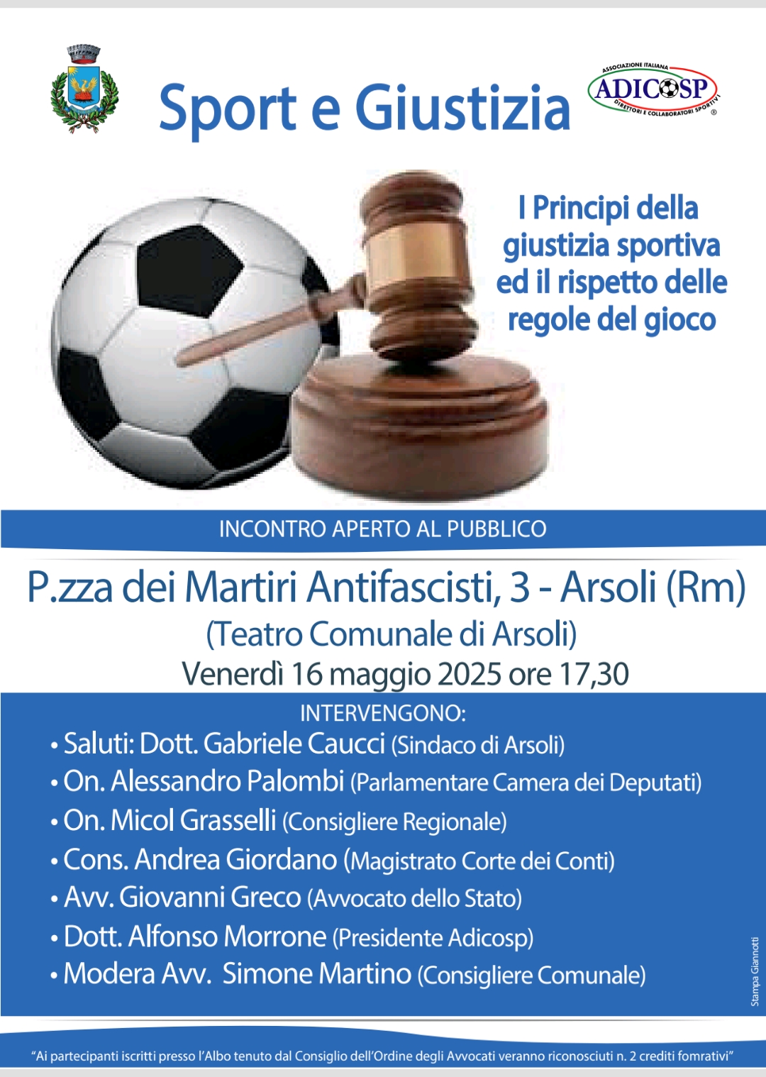 ARSOLI – L’appuntamento è per Venerdì 16 maggio 2025 alle ore 17.30 presso il Teatro Comunale di Arsoli. In tema un argomento di grande interesse: Sport e giustizia. L’evento è accreditato come formazione per l’ordine degli avvocati con riconoscimento di n. 2 crediti formativi.