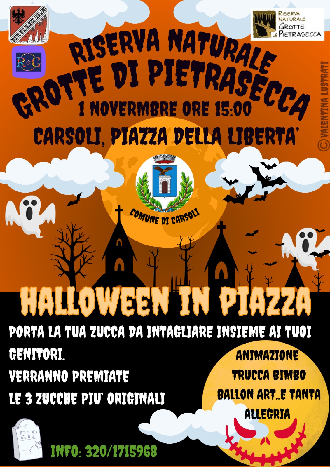 CARSOLI – Protagonista l’arte creativa a Carsoli per l’appuntamento con la festa di Halloween. Save the date Mercoledì 1° novembre 2023 alle ore 15.00 in piazza della Libertà, il comune di Carsoli e la Riserva Naturale speciale “Grotte di Pietrasecca” organizzano un evento unico nel suo genere. Oltre alla voglia di stare insieme, truccabimbi, musica, animazione, ballon art, ci sarà anche la possibilità di intagliare una zucca e realizzarla a tema di Halloween. Il tutto rigorosamente in live. Al termine del laboratorio  saranno premiate le tre zucche realizzate in modalità più originale valutate da una qualificata giuria. L’evento è rivolto a tutti, famiglie, nonni, piccoli, ragazzi. Il sindaco Velia Nazzarro invita tutti a partecipare.