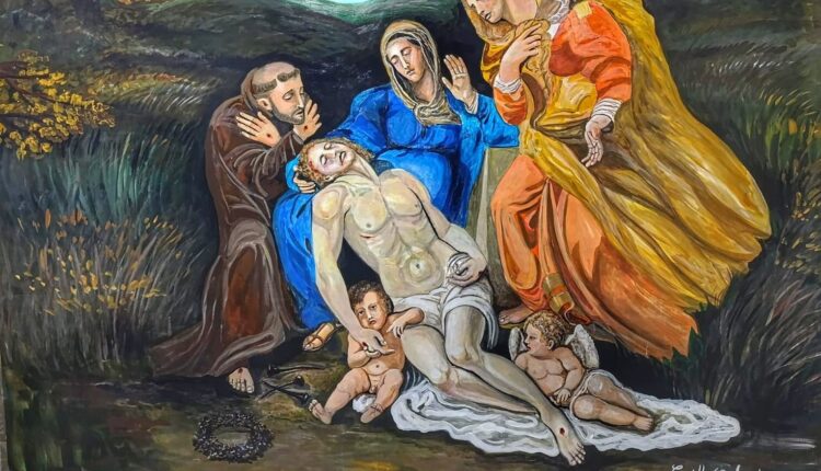 La Pietà rappresenta uno degli episodi più significativi che la Chiesa contempla nel Triduo Pasquale: la Passione, Morte e Risurrezione di Gesù Cristo. Oltre al corpo di Cristo e alla figura della Madonna, il dipinto raffigura anche San Francesco d’Assisi e Santa Maria Maddalena.