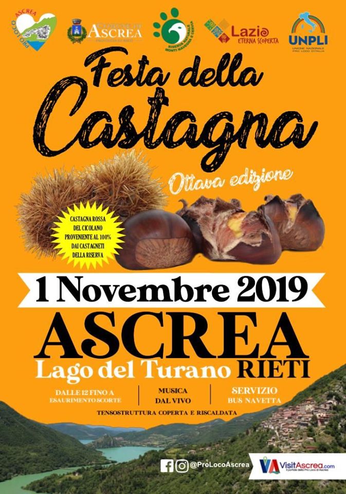 Ascrea  – Primo novembre 2019: eccoci arrivati all’appuntamento più importante dell’ Autunno Ascreano , quello con la Castagna Rossa del Cicolano, regina dei nostri boschi e protagonista assoluta della ottava edizione della Festa della Castagna. Ci si potrà lasciare trasportare dai sapori del  menù tipico tra i castagneti Ascreani, dove cresce spontanea questa “umile ricchezza”, che anticamente rappresentava uno dei prodotti preminenti del settore agricolo nel paese. Le piante secolari  donano questo frutto autunnale che le esperte mani delle cuoche sapranno declinare deliziosamente all’interno del menù proposto. Ancora una volta sarà una sagra Made In Rieti, realizzata esclusivamente con prodotti della nostra provincia, ancora una volta tanto divertimento con la musica dal vivo, ancora una volta il servizio navetta CamperFriendly per i nostri affezionati amici camperisti. L’organizzazione ha predisposto per il  pranzo, ma per gli chi volesse trascorrere una mattinata passeggiando tra i  castagneti l’appuntamento è  alle 9.00 con l’escursione organizzata dalla guide ufficiali della Riserva Monti Navegna e Cervia.