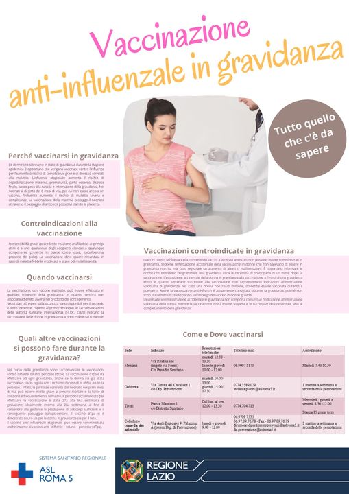 La Asl Roma 5 ha pubblicato tutte le informazioni utili per il vaccino antinfluenzale per le donne in gravidanza. Le donne che si trovano in stato di gravidanza durante la stagione epidemica è opportuno che vengano vaccinate contro l’influenza per l’aumentato rischio di complicanze gravi e di decesso correlati alla malattia. Di seguito tutte le informazioni utili, a cura del Distretto sanitario.