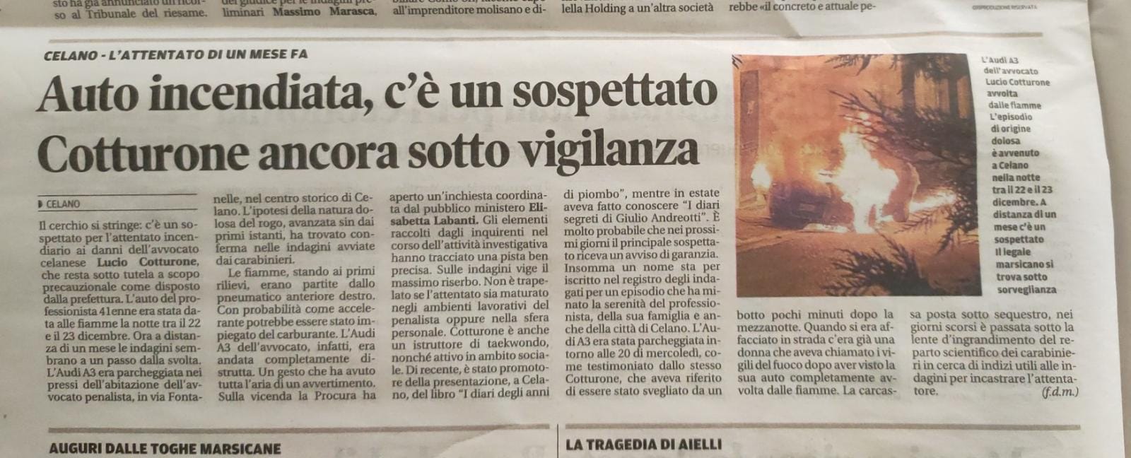 CELANO – Si sono concluse le perizie e gli esami in dettaglio della Audi A3 di proprietà dell’Avvocato Lucio Cotturone che venne data alle fiamme nella notte tra il 22 ed il 23 dicembre del 2021. Un episodio molto grave sul quale sin da subito venne accertata l’origine dolosa. La carcassa, nella quale restarono intatti alcuni libri dell’avvocato detenuti nel sedile posteriore, venne subito posta sotto sequestro giudiziario per gli accertamenti di rito. Durante questi mesi, le indagini sono andate avanti a spron battuto, ed il dissequestro evidenzia sicuramente che i rilievi della scientifica, le perizie abbiano potuto fornire già evidenti risposte nel merito di una vicenda a tinte fosche.
