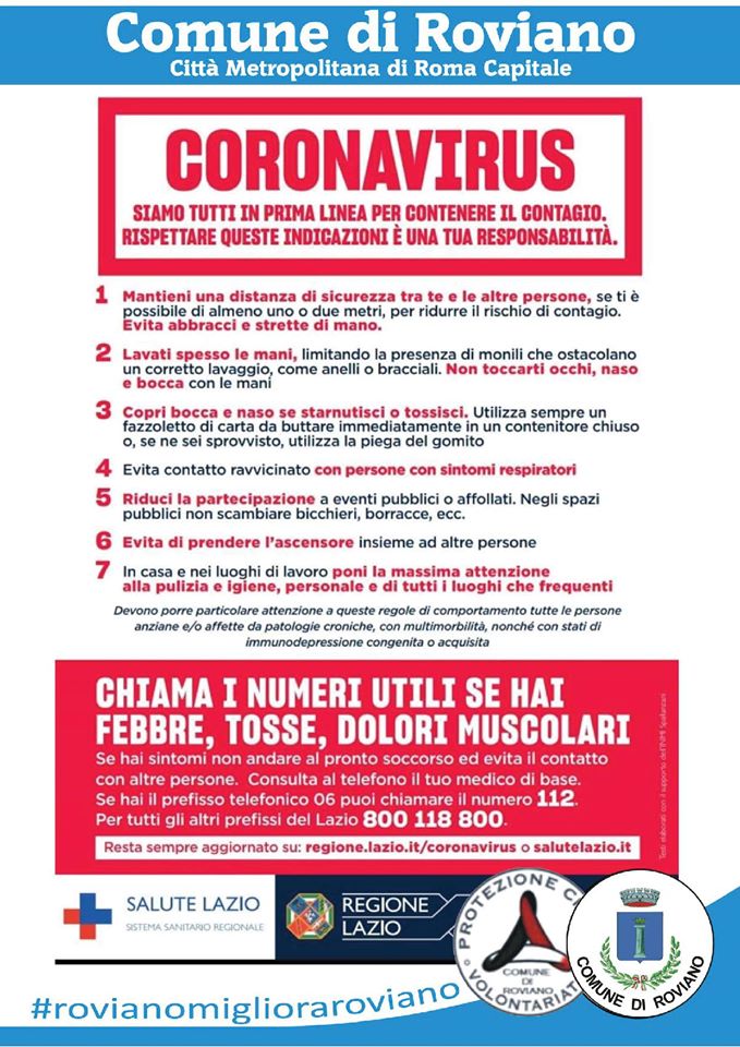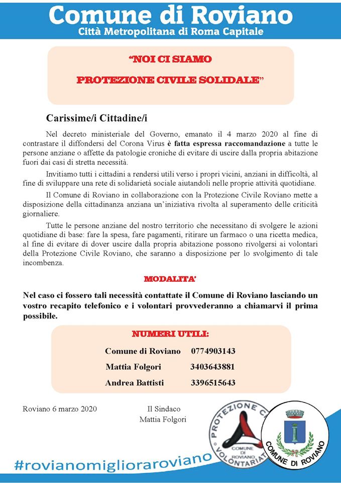Roviano – Arriva a Roviano la protezione civile solidale. Nel fine settimana i volontari della Protezione Civile di Roviano distribuiranno nelle abitazioni dei Cittadini i volantini del servizio di supporto alle persone anziane.  Si confida nella massima collaborazione. Lo comunica il sindaco Mattia Folgori