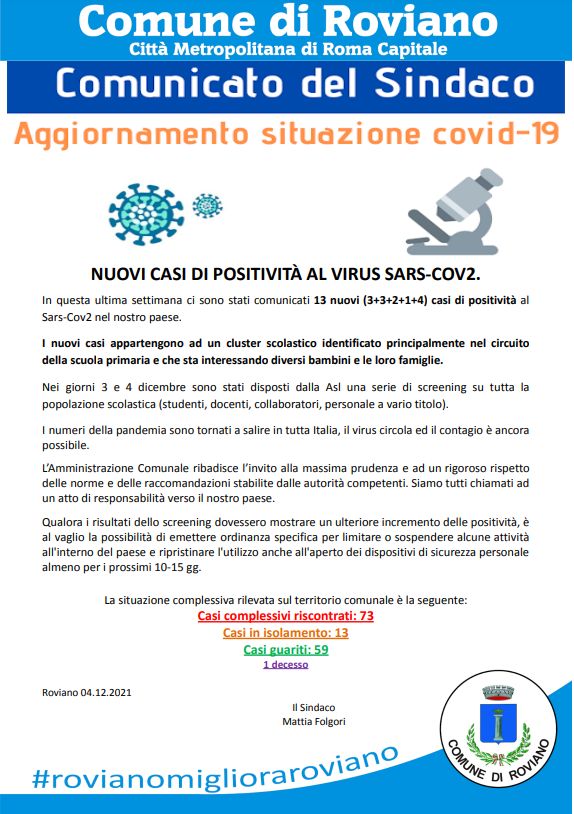 Roviano – Sono stati notificati altri 13 casi di infezione al covid 19 dalla Asl Roma 5 al sindaco Mattia Folgori. Una recrudescenza molto importante sta purtroppo interessando il territorio di Roviano in cui risultano  essere stati riscontrati n. 73 casi di infezione complessivi, intesi dall’inizio della pandemia covid 19.   Alcune iniziative, come l’incontro di presentazione del libro della scrittrice Gioia Chiostri presso la biblioteca è stato rinviato per precauzione.