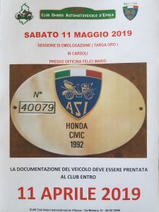 Carsoli – Dopo il grande successo dello scorso anno anche per il 2019 è stata riaffidata dall’ASi a Riccardo Zazza,  la sessione omologativa auto (targa oro )  che si svolgerà a Carsoli Sabato 11 maggio 2019 . Sono già  tanti gli iscritti e molti altri ne arriveranno nei prossimi giorni