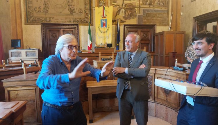 Appena giunto ad Avezzano per l’evento promosso dall’assessore alla cultura, Pierluigi Di Stefano, curato dal giornalista Raffaele Castiglione Morelli, il grande saggista è stato accolto in Municipio dal vice sindaco, Domenico Di Berardino, il presidente del consiglio, Fabrizio Ridolfi e altri amministratori. Qui, aver ammirato i dipinti della sala consiliare, Sgarbi ha ricevuto in dono un prezioso piatto di ceramica dipinto a mano dai maestri artigiani di Castelli, raffigurante la collegiata di San Bartolomeo.