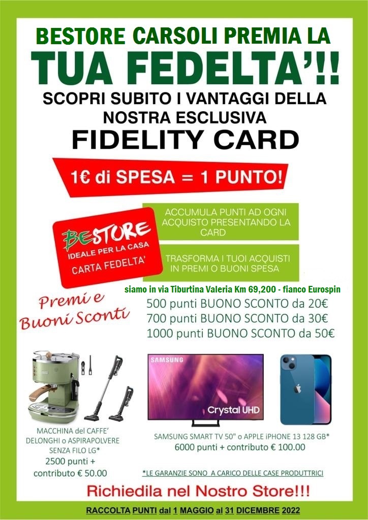 CARSOLI – Al via l’esclusiva fidelity card al BeStore di Carsoli. Un premio per la fedeltà riservato alla clientela che potrà acquistare nell’amplissimo show room. Buoni punti con sconti e tante nuove offerte riservate per la migliore resa alla minima spesa.