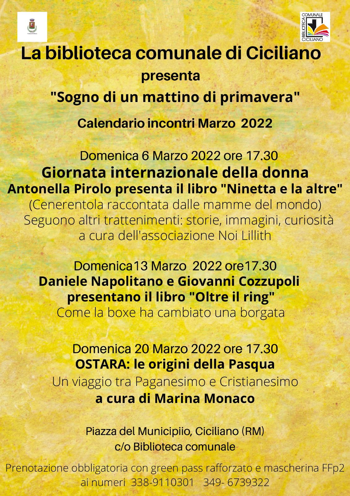 Ciciliano – La Biblioteca comunale di Ciciliano torna anche a marzo con un nuovo calendario di eventi, “Sogno di un mattino di primavera”. Tre nuovi appuntamenti per intrattenere e allietare il pubblico con belle iniziative culturali.