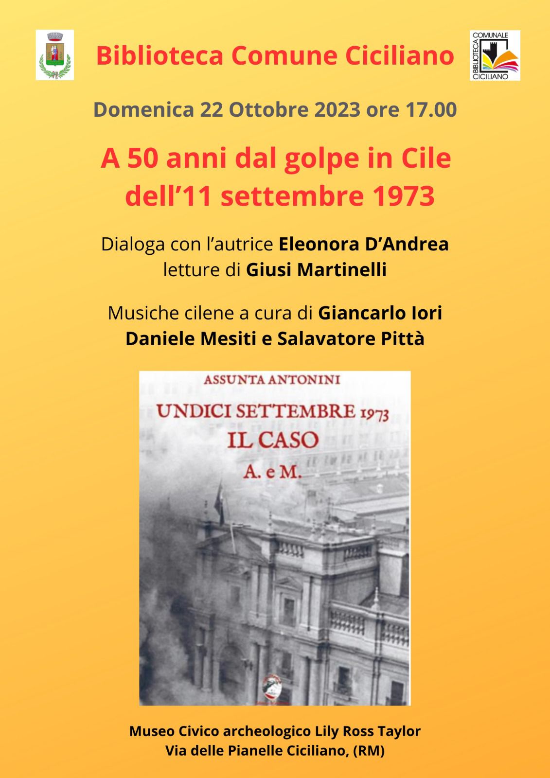 Ciciliano – La nuova stagione autunnale culturale è in arrivo a Ciciliano, organizzata dall’attivissima Biblioteca comunale: si parte il 22 Ottobre 2023 alle ore 17.00, presso il Museo Civico archeologico Lily Ross Taylor, con la presentazione del libro “A 50 anni dal golpe in Cile dell’11 settembre 1973” di Assunta Antonini. Dialoga con l’autrice Eleonora D’Andrea, letture di Giusy Martinelli. L’incontro verrà animato dalle musiche a cura di Giancarlo Iori, Daniele Mesiti e Salvatore Pittà.