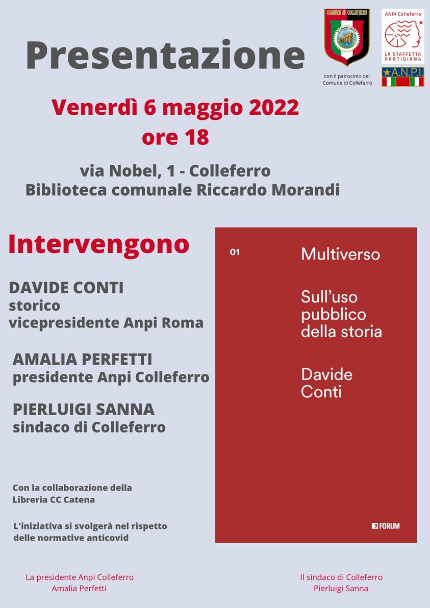 Colleferro – Con il patrocinio del comune di Colleferrro, venerdì 6 maggio alle 18 presso la Biblioteca Comunale Riccardo Morandi sarà presentato il libro di Davide Conti ”Sull’uso pubblico della storia” edito da Forum Editrice Universitaria Udinese.