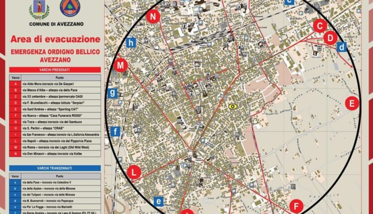 Avezzano. “Questa abitazione o attività rientra nella zona ‘a rischio’. È, quindi, da evacuare per il tempo necessario alle operazioni di disinnesco. Durante le operazioni, sarà vietato trovarsi all’interno dell’area interdetta”.