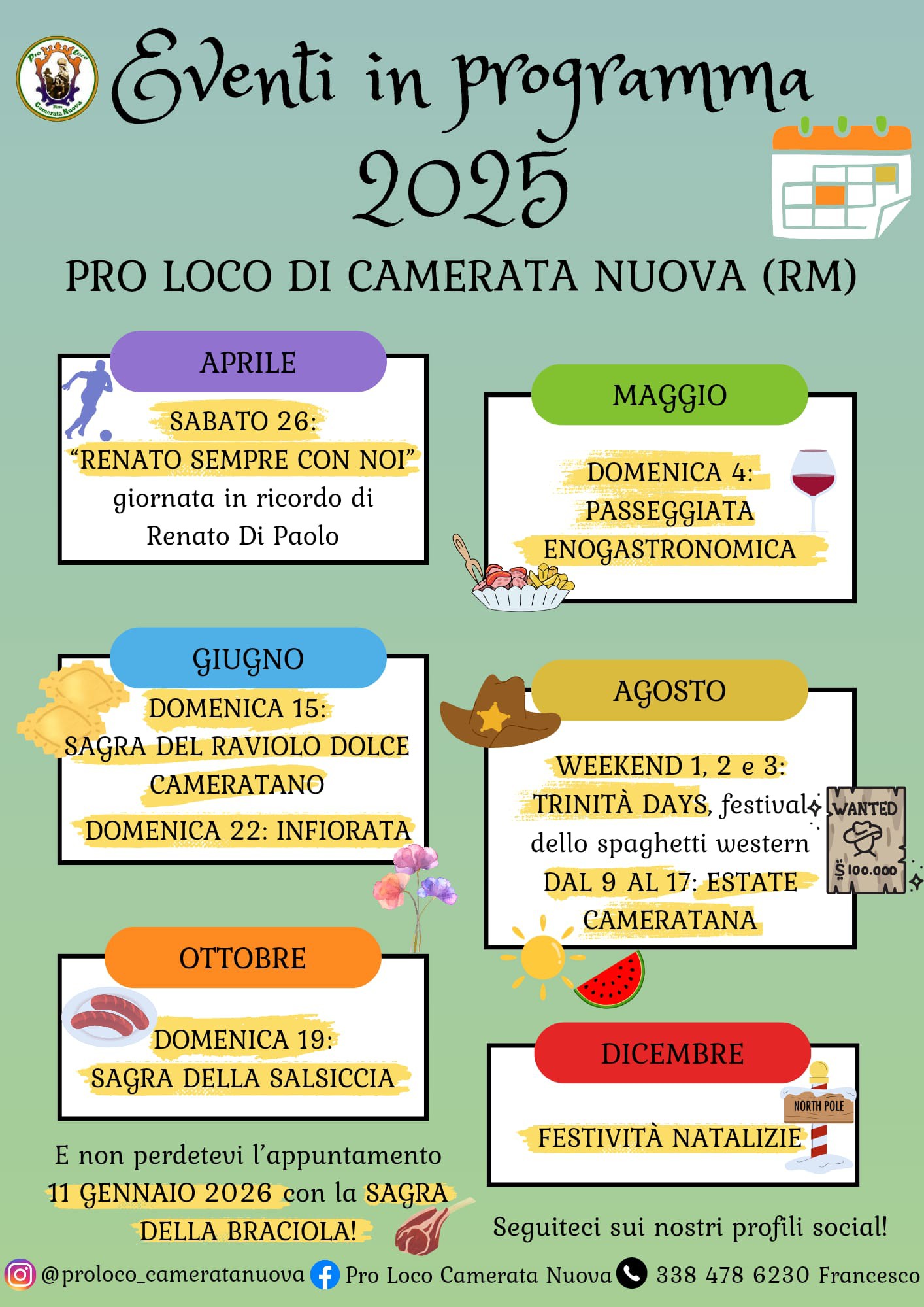 CAMERATA NUOVA – La Pro loco di Camerata Nuova ha reso noto il calendario di massima degli eventi in programma per la stagione 2025. Tante iniziative, tutte di spessore, di seguito la locandina con i dettagli: