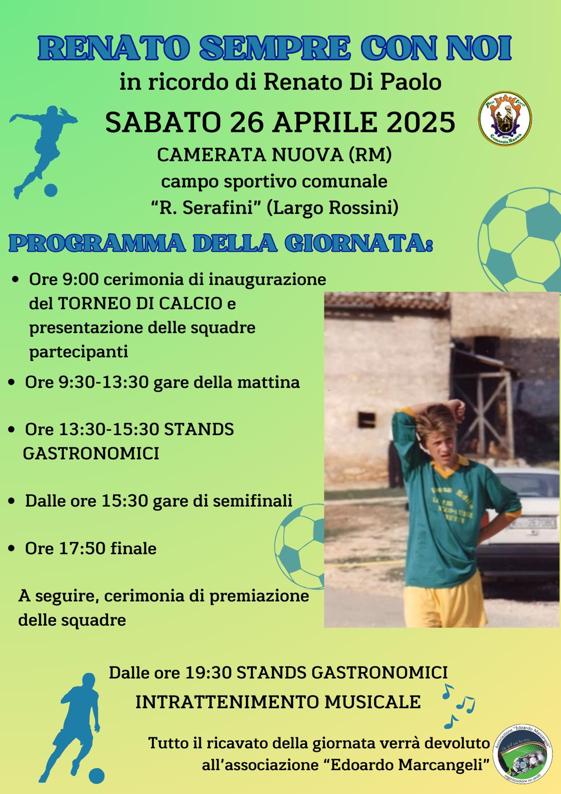 CAMERATA NUOVA – Renato sempre con noi, questo il leit motiv per un evento all’insegna della memoria e dello sport. L’appuntamento è per sabato 26 Aprile 2025 presso il campo Sportivo di Camerata Nuova per una giornata importante. Dopo i tornei, premiazione  e cena conviviale all’insegna della musica. Il ricavato dell’evento sarà devoluto all’Associazione Edoardo Marcangeli Onlus di Carsoli.