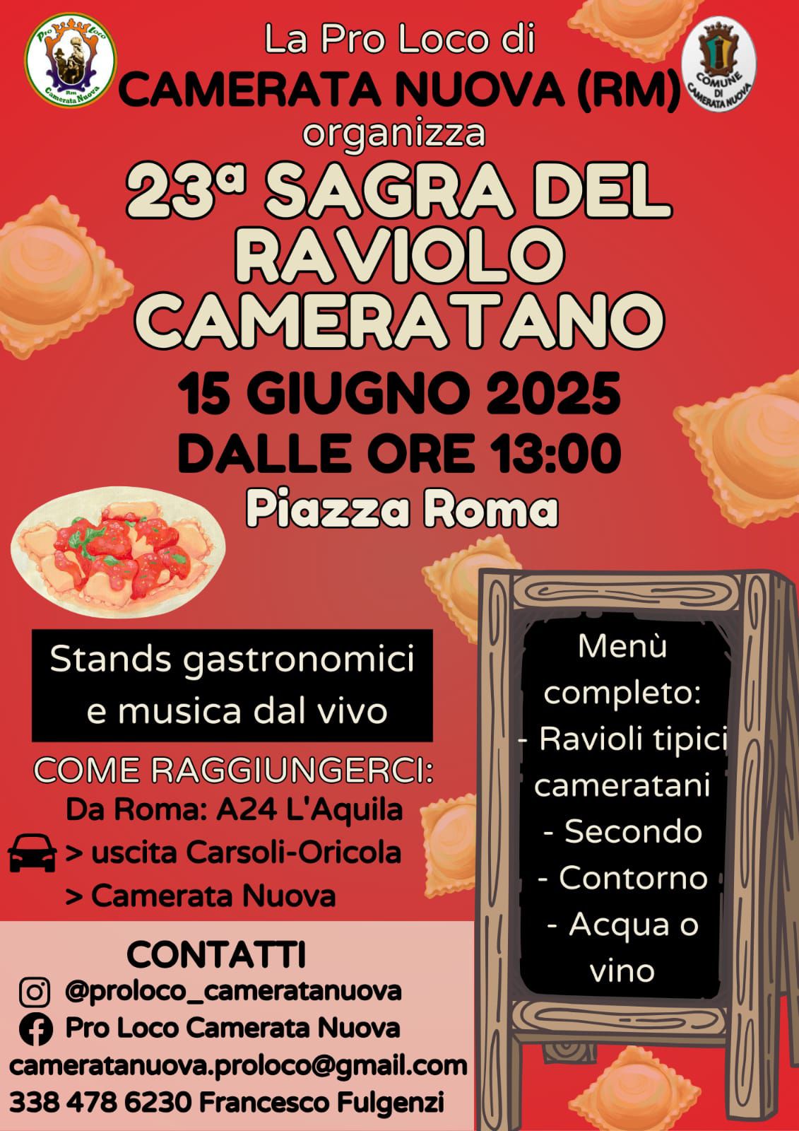 CAMERATA NUOVA (RM) – Grande attesa per domenica 15 giugno 2025, a partire dalle ore 13:00, la pittoresca Piazza Roma di Camerata Nuova si trasformerà nel cuore pulsante del gusto e della tradizione. La Pro Loco del paese organizza la 23ª Sagra del Raviolo Cameratano, un evento imperdibile per gli amanti della buona cucina e delle atmosfere di festa.