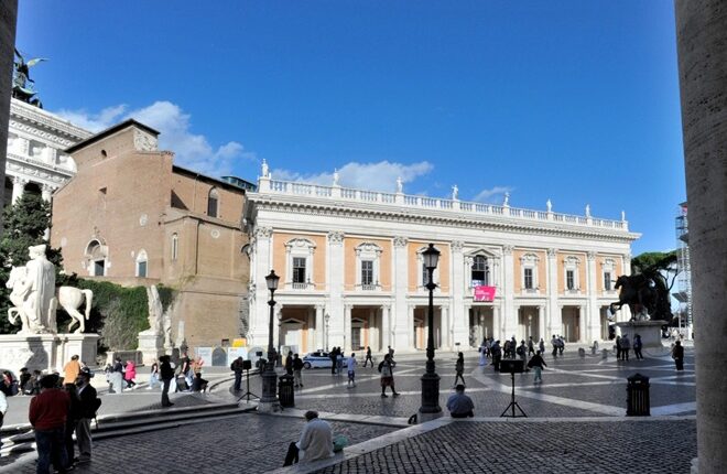Nel 1538 papa Paolo III affidò a Michelangelo l’incarico per la nuova sistemazione di piazza del Campidoglio. Il progetto conferì unità architettonica agli edifici capitolini preesistenti: Palazzo Senatorio e Palazzo dei Conservatori. I lavori proseguirono con Giacomo della Porta, Girolamo e Carlo Rainaldi, fino alla fine del ‘600, con il completamento di Palazzo Nuovo.