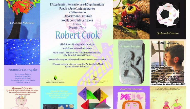 In Convenzione formativa con l’Università degli Studi di Roma Tre, con il Patrocinio della Regione Lazio, di Roma Capitale, del Comune di Canale Monterano e dell’Istituto Comprensivo di Manziana, l’Accademia Internazionale di Significazione Poesia e Arte Contemporanea, in collaborazione con l’Associazione Culturale Nobile Contrada Carraiola, cerimonia il Premio d’Arte Robert Cook 2021 con mostra artistico-letteraria dei bambini, poster delle opere, critiche in semiotica estetica in diploma della presidente dell’Accademia prof.ssa Fulvia Minetti, conferimento commemorativo ad opera del figlio compositore Henry Cook di tre medaglie cookiane in pregiata fusione a cera persa in argento ed incisione pantografata del laboratorio orafo di Via Margutta, riconoscimenti della giuria accademica, premi alla memoria degli artisti Alberto Marani e Angelo Di Vico, presso la Scuola primaria di Canale Monterano di Roma il 28 maggio 2021 dalle ore 11,00.