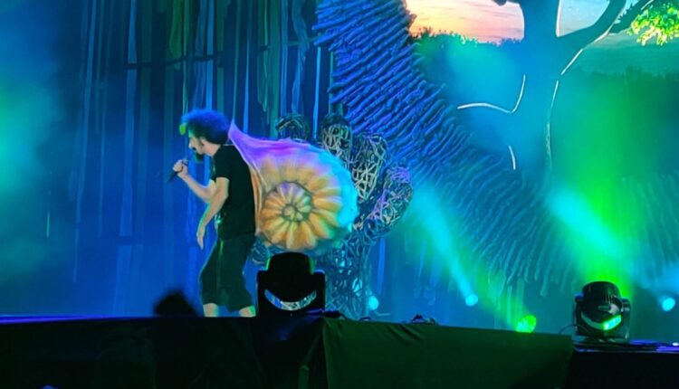 Ma sul palco di Caparezza, accompagnato oltre che dal fidato Diego Perrone e dalla sua band anche da quattro ballerini, c’è spazio anche per letti e altalene, troni e sedie, vasi di fiori e funghi, castelli di carte e musicassette (e il rapper quasi si è scusato con il suo pubblico più giovane: “Non vi spiego nemmeno cosa fosse questo oggetto”). Tutto rigorosamente in formato extra large. In pratica, per ognuna delle canzoni dell’ultimo album – tutte in scaletta tranne una, ‘Azzera pace’ – sul palco è arrivato qualcosa di nuovo ad accompagnare la scenografia dominata da un sole formato da rami di alberi, a voler richiamare la foresta. Quest’ultima, insieme al momento di passaggio da una fase a un’altra, è il tema portante dell’ottavo disco di Caparezza, come ha spiegato lo stesso artista sul palco definendo ‘Exuvia’ un album “molto difficile e da me molto amato”.