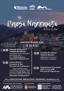 “Paesi Narranti…A passi di Vita”, nel borgo di Capestrano, è il primo di una serie di eventi del progetto “A Passi di Vita” ideato dalla cooperativa Il Bosso con la preziosa collaborazione di Paesaggi Sonori e dello scrittore Alessandro Chiappanuvoli, patrocinato dal Comune di Capestrano e finanziato dalla Fondazione CarispAq e con la collaborazione della Pro loco di Capestrano e del Centro Studi di San Giovanni di Capestrano.