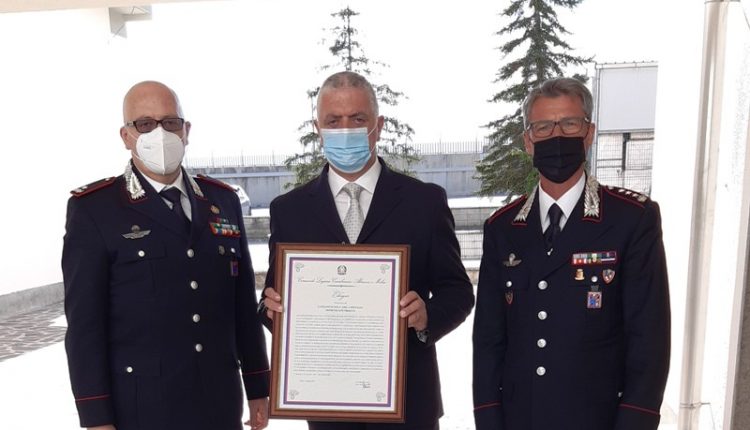 L’Aquila -Nel pomeriggio di ieri, presso il Comando Provinciale dei Carabinieri di L’Aquila, il Comandante della Legione Carabinieri Abruzzo e Molise, Generale di Brigata Paolo ACETO, alla presenza del Comandante Provinciale, Col. Nazareno SANTANTONIO, e di una rappresentanza del personale dell’Arma della sede, ha consegnato al Luogotenente C.S. Domenico PETROCCO, in congedo da pochi giorni, un “ELOGIO” per il lodevole e costante elevato rendimento in servizio.