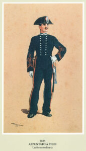 La scelta dovrà quindi essere fatta cadere sui Carabinieri provvisti di rafferma con premio, i quali per i buoni servizi resi, per la buona condotta serbata, per la fermezza del contegno, per la maggior conoscenza del servizio e zelo nell’eseguirlo diano arra di essere ognora di buon esempio ai Carabinieri e di aiuto al Comandante di Stazione nel mantenere la disciplina». Dal 1939 il distintivo di grado per appuntato assunse la forma a “V” formato da nastro rosso alto 35 mm.”