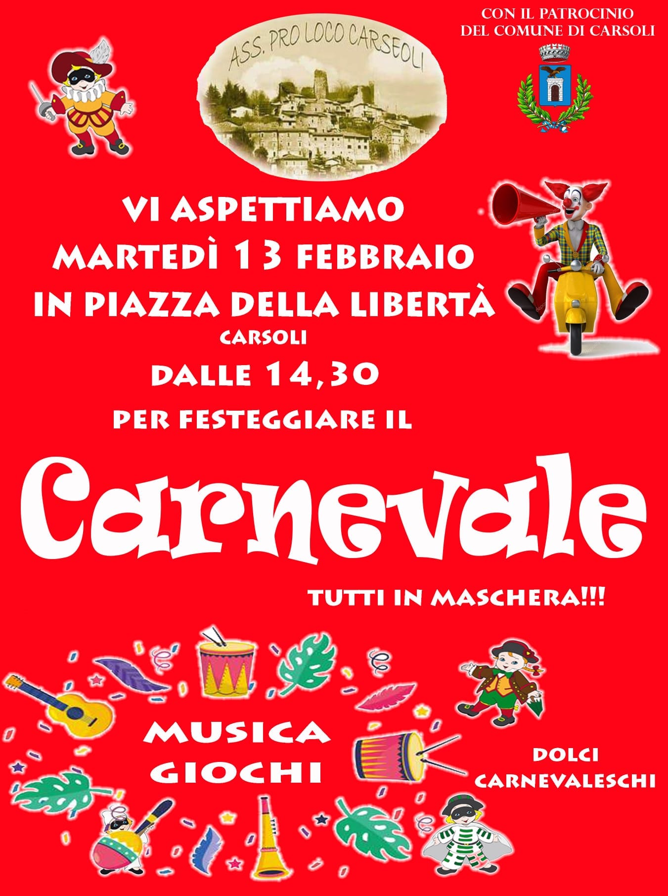 CARSOLI – Appuntamento oggi dalle 14.30 in piazza della Libertà, tutti in maschera per l’evento organizzato dalla Pro loco Carseoli in collaborazione con il comune di Carsoli. Di seguito il dettaglio evento: