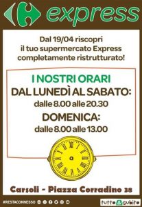 Gli orari – D’ora in poi non ci sarà più il problema per la fretta dell’ora di pranzo, o il rischio di affrettarsi per la spesa prima di cena. Carrefour Express sarà a disposizione della gradita clientela sin dalle ore 8.00 del mattino e fino alle ore 20.30 la sera. Un modo per essere ancora più vicini alle esigenze della clientela e di consentire a tutti di “fare la propria spesa” in ogni orario della giornata.