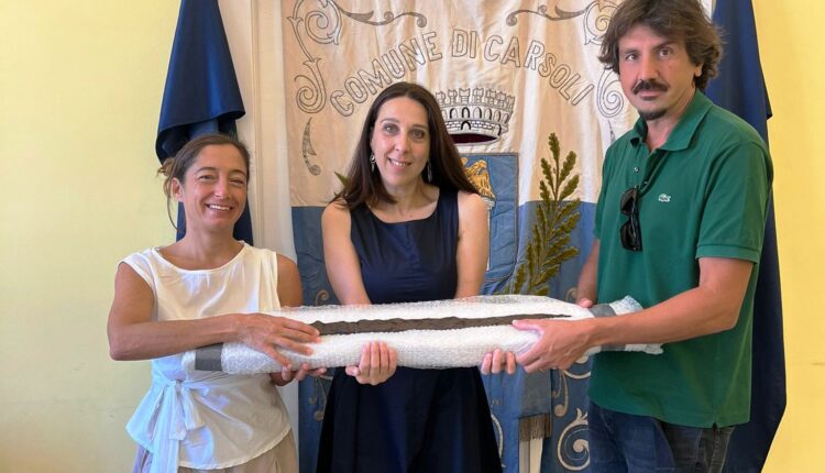 Carsoli – Ieri mattina presso il Comune di Carsoli, alla presenza della Dott.ssa Francesca Romana Del Fattore, Soprintendenza Archeologia, Belle Arti e Paesaggio delle Province di L’Aquila e Teramo, è stata riconsegnata dal Dott. Enrico Montanelli, Restauratore, la Spada in Ferro rinvenuta durante gli scavi di Valle Mura nella tomba 17. La spada risalente al periodo Arcaico, ovvero a circa 2600 anni fa, verrà custodita ed esposta in una teca insieme ad altri reperti archeologici riportati alla luce sempre a Valle Mura.