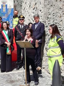 In questa area, denominata anticamente “ju bastione”, avvenne la distruzione principale delle bombe che distrussero improvvisamente case, palazzi, provocando morte e distruzione. L’obiettivo era l’uccisione di un gerarca tedesco, missione che però ebbe a fallire provocando nella città di Carsoli una distruzione che segnerà il destino di molte famiglie e provocò sofferenza e crisi economica e sociale per diversi anni. Il Sindaco Velia Nazzarro durante il suo discorso ha ricordato il sacrificio delle vittime, e riaffermata l’esigenza del rispetto dei valori delle istituzioni e della pace nel rievocare la guerra. Presente alla cerimonia anche Nancy Valentina Vezza, figlia della compianta Antonietta Cangelmi, nativa di Carsoli poi emigrata in America. La Vezza, dopo la recente scomparsa della madre ha rinvenuto una serie di testimonianze scritte della propria congiunta che narra le sofferenze intense dei bombardamenti, morte, dolore e distruzione. In occasione del