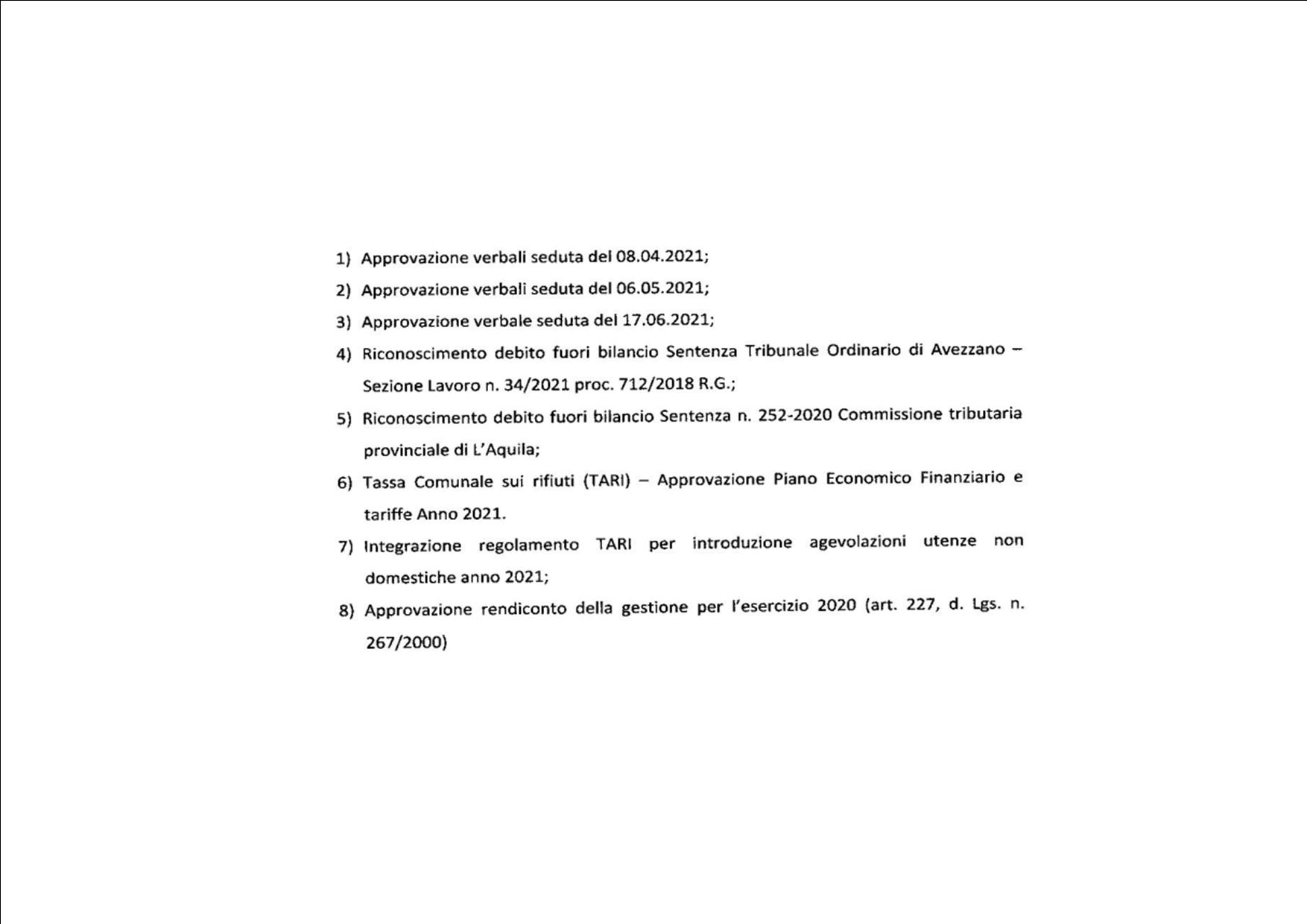 Carsoli –  E’ stata disposta la convocazione del consiglio comunale per il giorno 15 luglio 2021 alle ore 18.00 in sessione ordinaria. 6 gli argomenti posti in discussione all’ordine del giorno: