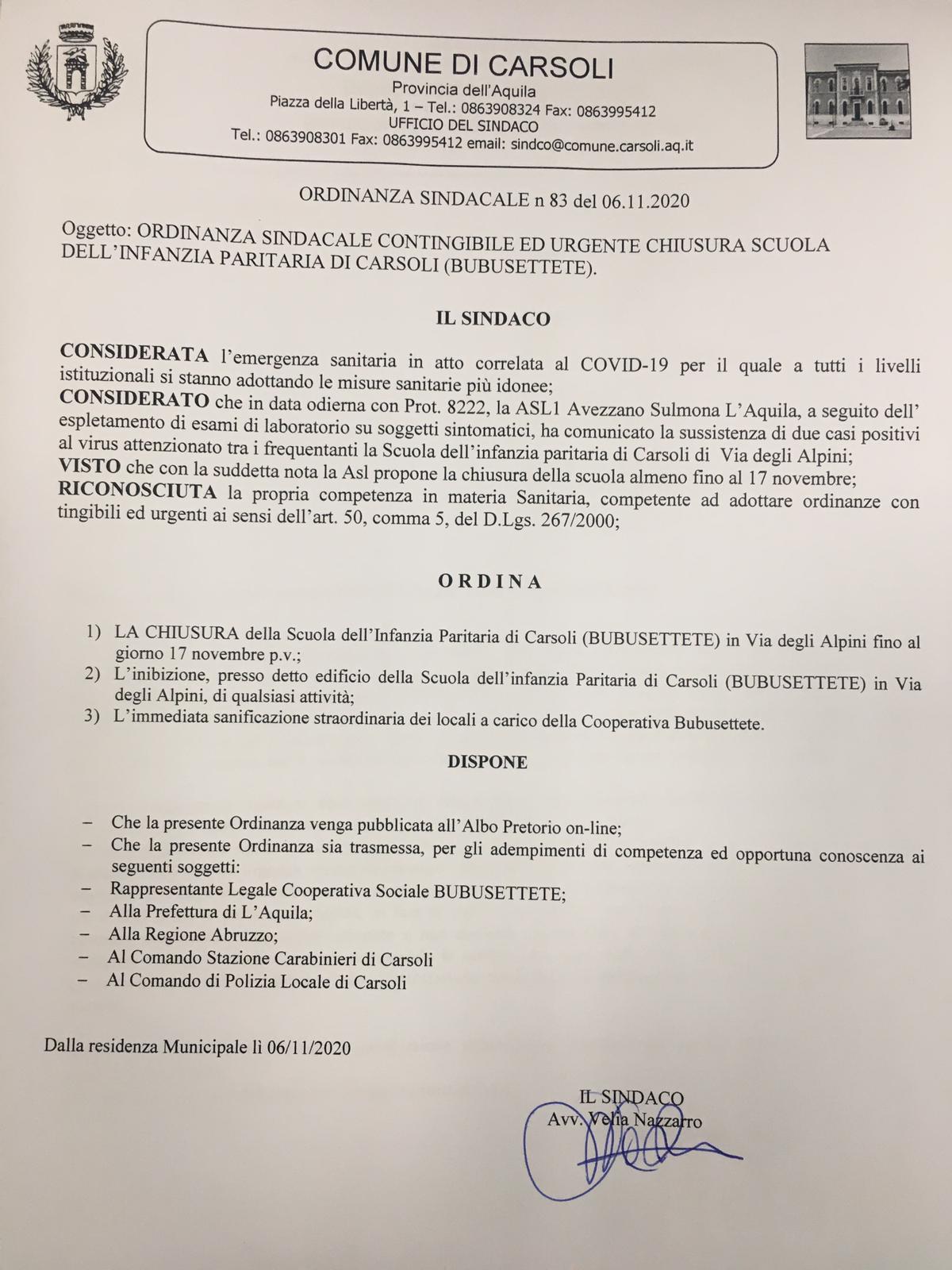 Carsoli – Con l’ordinanza di cui in allegato il sindaco di Carsoli Velia Nazzarro ha emanato una ordinanza contingibile ed urgente disponendo la chisuura per la scuola dell’Infanzia Paritaria di Carsoli fino al 17 novembre 2020. Il provvedimento è stato adottato in conseguenza della segnalazione pervenuta dalla Asl di Avezzano a seguito della sussistenza di due casi positivi al covid 19.  Il sindaco ha parimenti ordinato interventi di sanificazione.