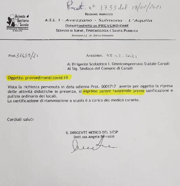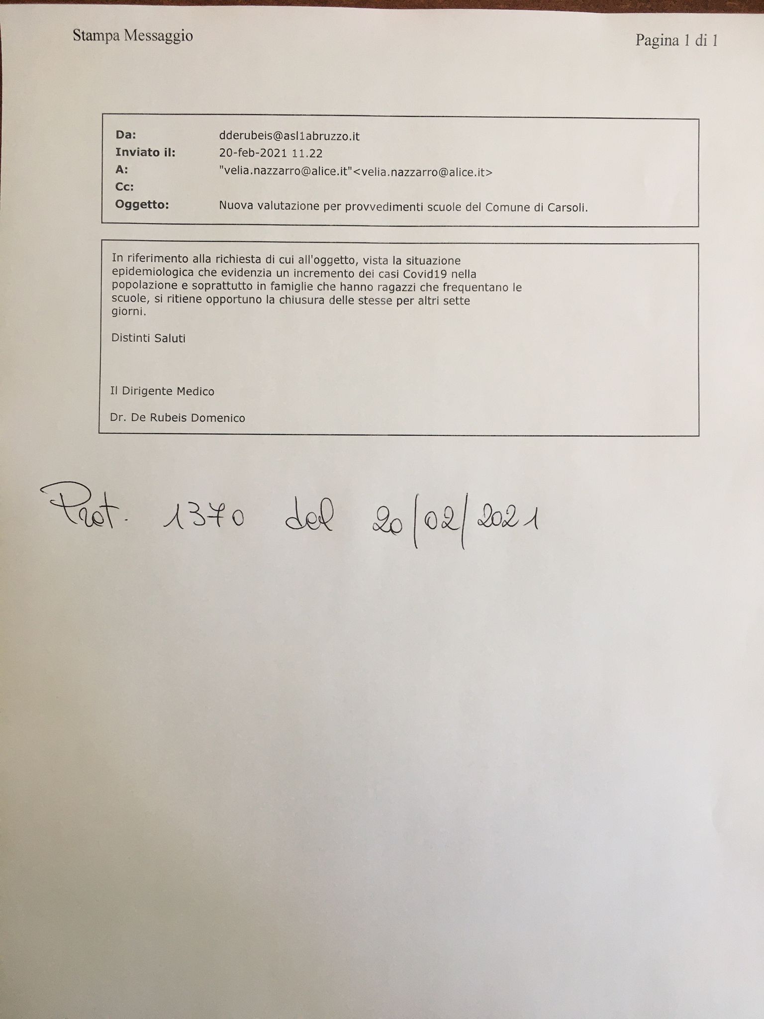 Carsoli – E’ stata disposta la chiusura degli edifici Scuola Elementare ed Istituto Omnicomprensivo di Carsoli con una nuova ordinanza del Sindaco Velia Nazzarro. “E’ stato intrapreso questo provvedimento – spiega il primo cittadino – in considerazione dell’evolversi della situazione epidemiologica nel nostro territorio comunale. Una situazione tenuta sotto costante controllo con i medici di base e che, per nostra valutazione, non presentava le condizioni ottimali e di sicurezza per far riprendere l’attività scolastica. E’ stato proprio in questo contesto, infatti, che i contagi si sono diffusi coinvolgendo intere famiglie. Il numero degli attuali contagiati non consente di riaprire in sicurezza nonostante interventi di sanificazione. Rispetto al parere favorevole della Asl, ritenuto non rispondente alle effettive esigenze di igiene e salute pubblica del territorio, ho dovuto riformulare il quesito, sul quale poi la medesima Asl ha riaggiornato il proprio parere uniformandolo a quello del sindaco”.